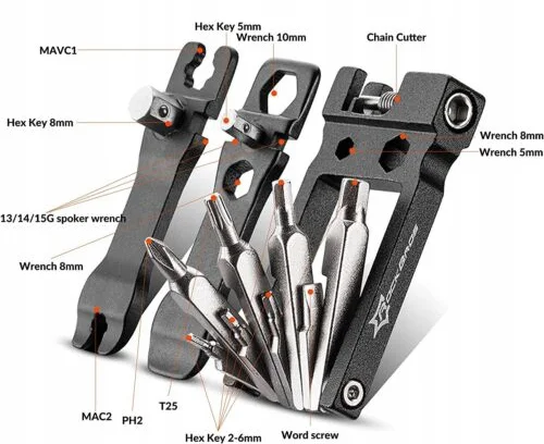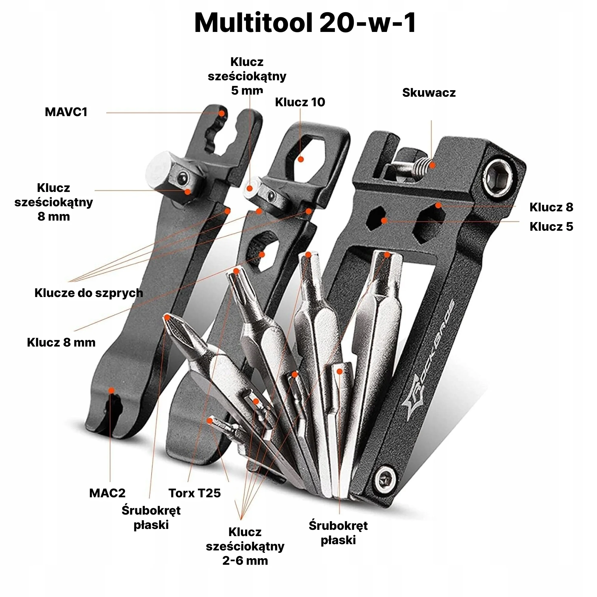 Jego zaletą jest aż 20 różnorodnych funkcji, dzięki którym przeprowadzisz praktycznie każdy, niezbędny podczas jazdy, naprawczy zabieg. W skład zestawu wchodzą sześć kluczy imbusowych o różnych rozmiarach, trzy klucze sześciokątne, klucze do szprych oraz specjalistyczne klucze MAVIC1 i MAVIC2. Dodatkowo znajdziesz tu dwa rodzaje śrubokrętów: krzyżakowy i płaski. Nie zabrakło też klucza Torx T25, który jest niezbędny w serwisowaniu nowoczesnych rowerów.