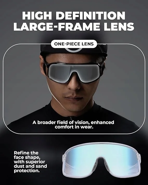 Wykonane z lekkiego i wytrzymałego materiału TR90, te sportowe okulary przeciwsłoneczne z polaryzacją oferują zarówno komfort, jak i wytrzymałość. Zauszniki zapewniają bezpieczne dopasowanie, a jednoczęściowa konstrukcja soczewek polaryzacyjnych skutecznie redukuje zniekształcenia wizualne, minimalizuje potencjalne ryzyko i zapewnia rowerzystom wyraźny widok na drogę.