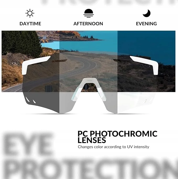 Soczewki fotochromowych okularów rowerowych ROCKBROS zmieniają kolor w zależności od ilości promieniowania ultrafioletowego, chroniąc oczy przed słońcem. Nadają się do całodziennego noszenia, a szczególnie do uprawiania sportów na świeżym powietrzu.