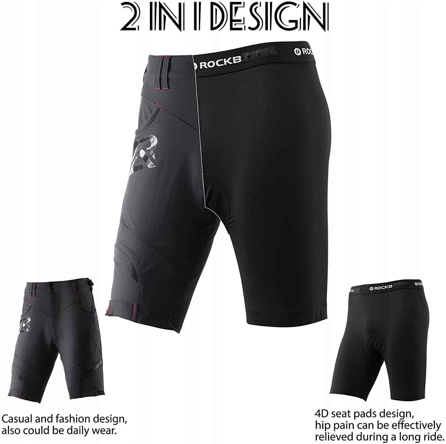- 【Wyjmowane wkładki ochronne 4D】Wzornictwo 2 w 1, spodenki MTB rowerowe z wyściółką 4D, spodenki rowerowe można szybko zdjąć za pomocą metalowych klamer. Spodnie rowerowe Rockbros wykorzystują gęstą i przepuszczającą powietrze piankę 4D o dużej elastyczności powrotnej; skutecznie likwidują bóle biodrowe.