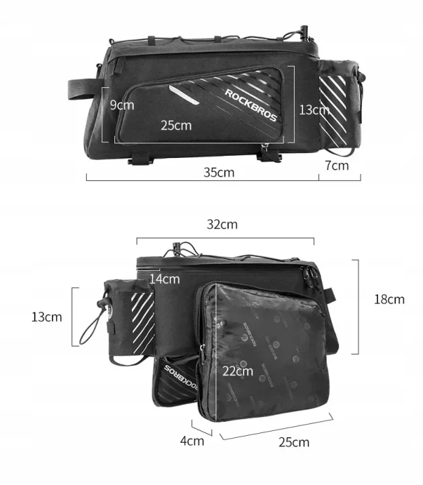 Przedstawiamy torbę rowerową Rockbros A9-BK. Ma dużą pojemność i pomieści wszystko czego potrzebujesz. W środku torby znajduje się duża ilość przegródek, co ułatwia dbanie o porządek. Odblaskowe elementy gwarantują bezpieczeństwo. Montaż na bagażniku jest niezwykle prosty i szybki.