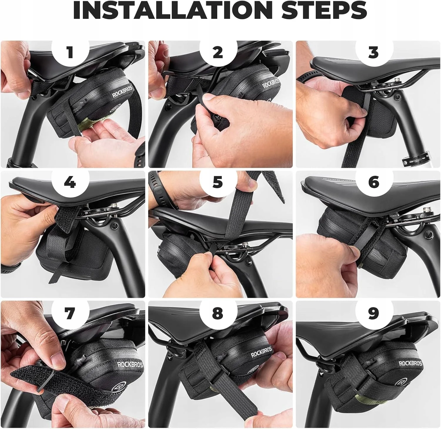 Torby na siodło można łatwo zamontować na wszystkich rozmiarach szyn siodełka. Zapięcia utrzymują torbę bezpiecznie przymocowaną do siodełka roweru i zapobiegają jej spadaniu.
