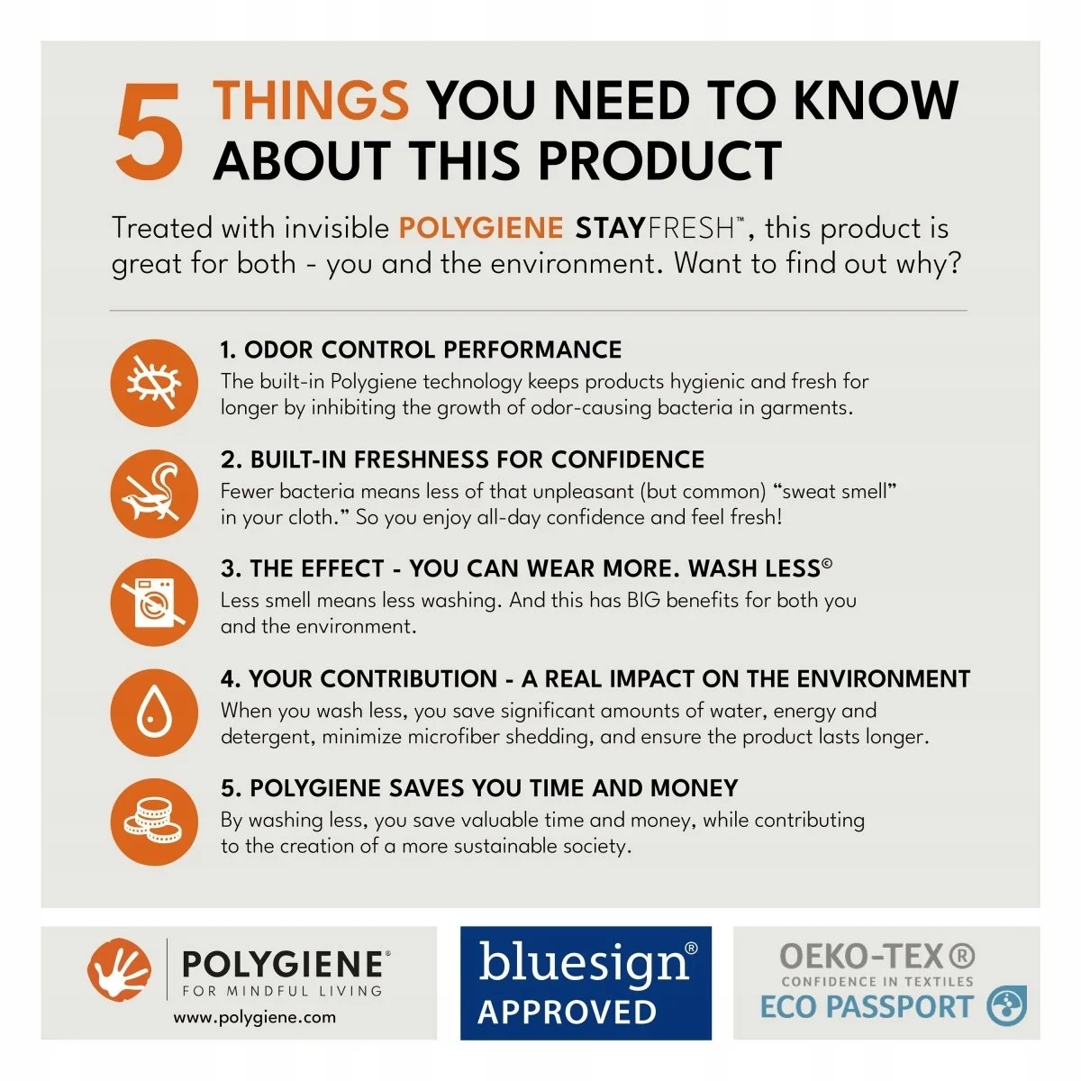 Polygiene StayFresh™ utrzymuje świeżość tego produktu dłużej i zmniejsza potrzebę częstego prania.