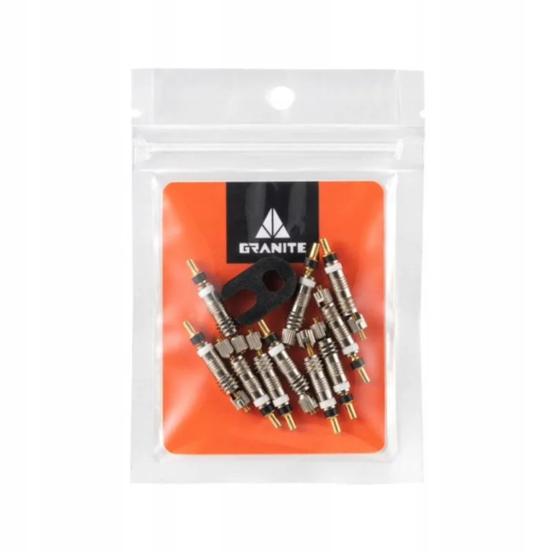 Pakiet zaworów Granite Presta zawiera 10 wysokiej jakości rdzeni zaworów, które zostały zaprojektowane tak, aby pasowały do trzpieni zaworów Presta, a także wygodne narzędzie instalacyjne. Rdzenie zaworów są wykonane z trwałych materiałów i doskonale nadają się do wymiany tych, które zostały zatkane uszczelniaczem do opon.