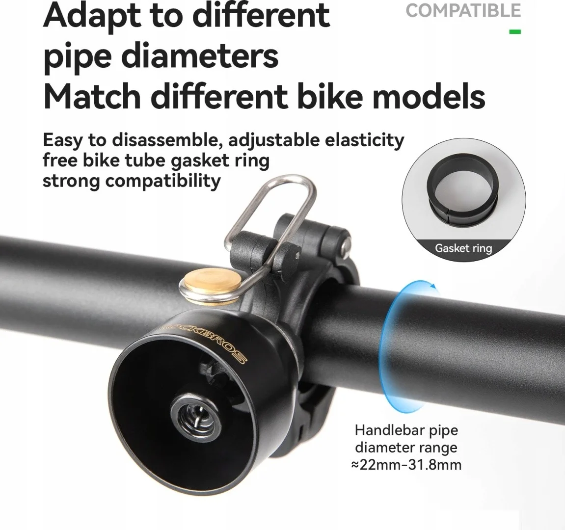 Uniwersalna kompatybilność: dzięki regulowanemu mocowaniu i dołączonym podkładkom na kierownicę dzwonek rowerowy pasuje do kierownicy roweru wyścigowego, górskiego, roweru elektrycznego, trekkingowego i dziecięcego. Szybki montaż, mocno zamocowany, nie ślizga się na nierównych drogach