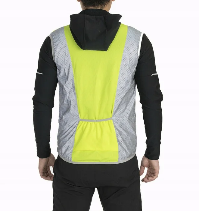 Niemal cały przód kamizelki i boki wykonane z odblaskowego materiału pokrytego drobnymi otworami dla lepszej oddychalności. Pozostała część kamizelki wykonana z elastycznego poliestru.