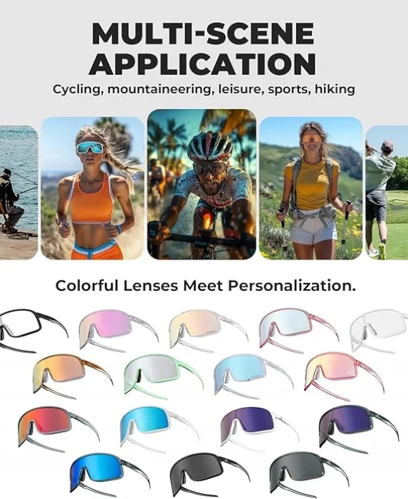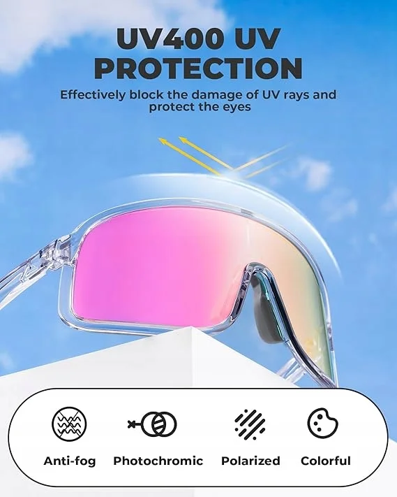Te okulary przeciwsłoneczne posiadają soczewki PC, które zmieniają kolor z jasnego na ciemny. Przyciemniają się w jasnym świetle słonecznym, aby zmniejszyć odblaski i zmęczenie oczu, a rozjaśniają się w pomieszczeniach lub przy pochmurnej pogodzie, aby zapewnić wystarczającą ilość światła. Ta inteligentna technologia eliminuje konieczność zmiany okularów w zależności od warunków oświetleniowych.