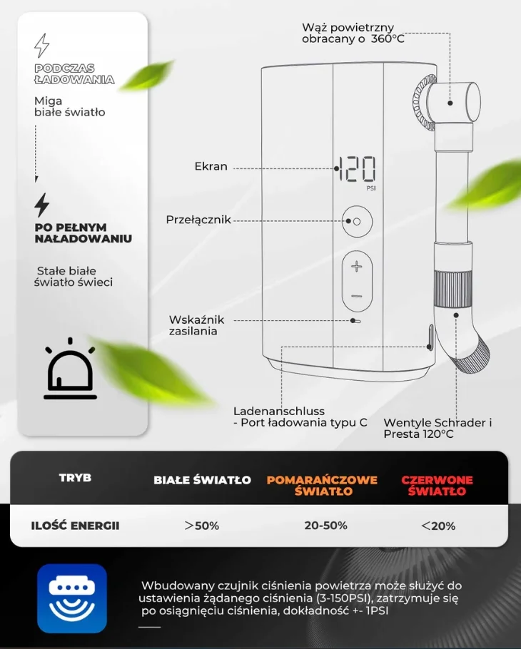 Ustaw żądane ciśnienie, a pompka sama się wyłączy po osiągnięciu poziomu. Oszczędza czas i eliminuje ryzyko przeładowania.