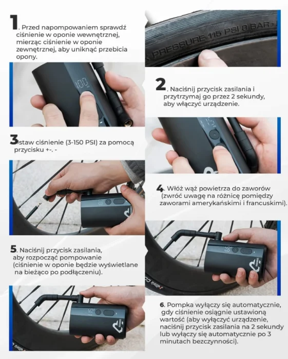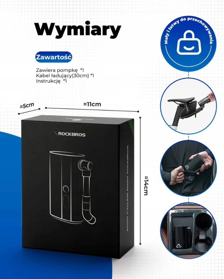 Ultrakompaktowa pompka o wymiarach 107 × 65 × 38 mm i wadze zaledwie 380 g. Dzięki ciśnieniu do 150 PSI oraz wbudowanemu akumulatorowi 5000 mAh, idealnie sprawdzi się w podróży – napompuje rowery, motocykle, małe samochody, piłki czy materace w kilka minut