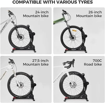Stojak jest kompatybilny z rowerami szosowymi, rowerami górskimi o kołach 24-27,5 cala i innymi popularnymi rowerami.