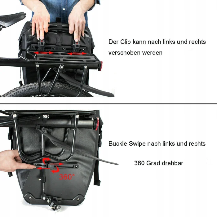 Regulowana klamra : ta wodoodporna sakwa wykorzystuje nową regulowaną klamrę do mocowania do różnych bagażników. Dzięki dwóm haczykom można dopasować długość górnej klamry.