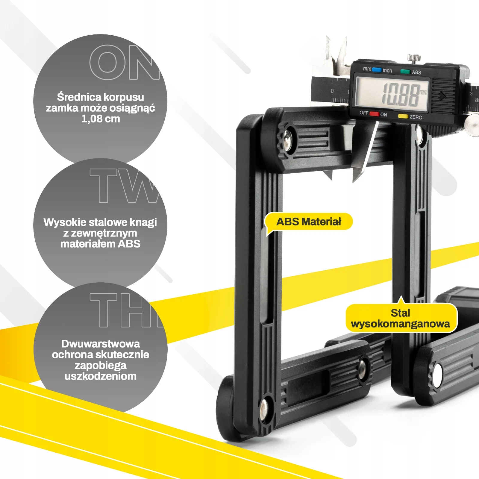 Blokada zbudowana jest z 6 paneli wzmocnionych stalą wysokomanganową i zewnętrznym ABS o całkowitej grubości 10,88 mm, które złączone są za pomocą nitów ze stali nierdzewnej zapewniając solidne oraz odporne na rdzę połączenia.