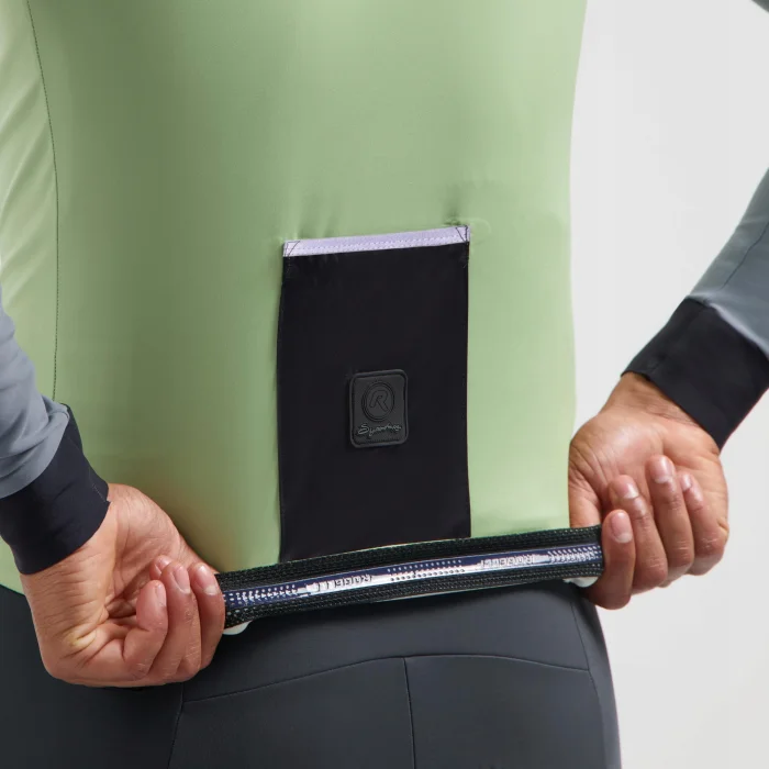 Przemyślany projekt łączy estetykę z funkcjonalnością: laserowo wykończone otwory na ramiona ułatwiają zakładanie, silikonowa taśma w pasie stabilizuje kamizelkę, a praktyczna tylna kieszeń pozwala na kompaktowe spakowanie kamizelki, gdy świeci słońce lub tempo jazdy wzrasta.