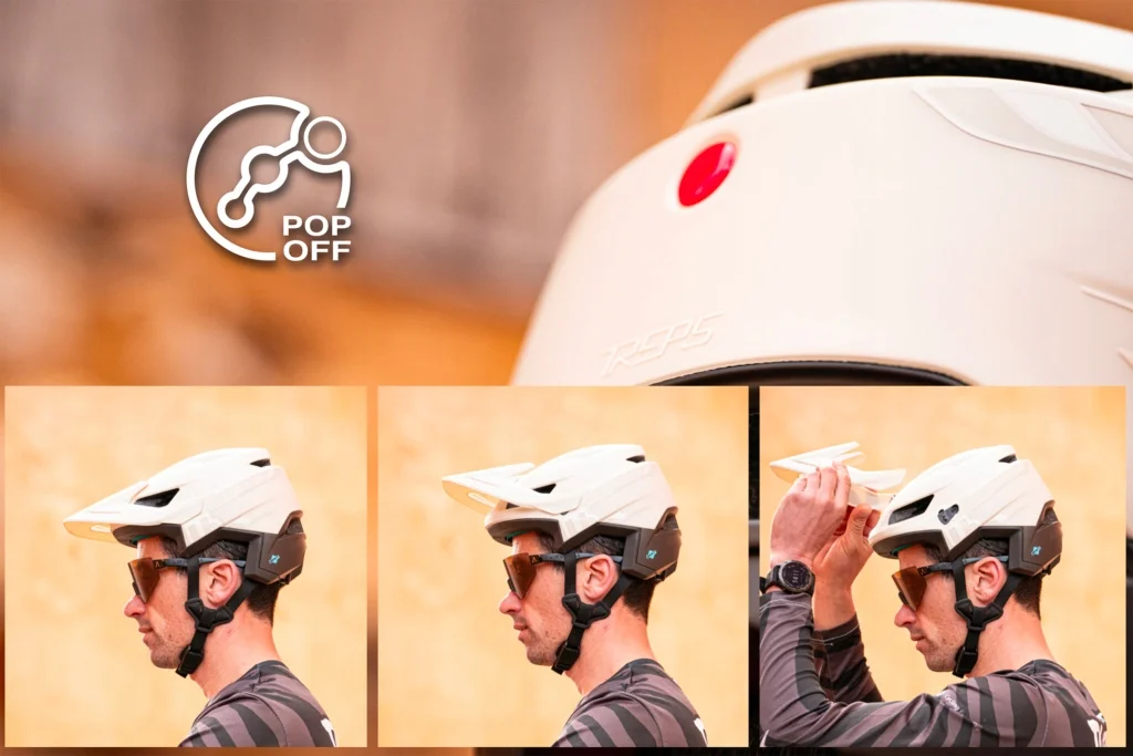 • Opatentowany daszek POP-OFF Nasz system oferuje 3 pozycje daszka: niską (domyślną), wysoką (do przechowywania gogli) oraz pozycję "Pop-Off". W momencie silnego uderzenia daszek odłącza się, co ma na celu zmniejszenie ryzyka obrażeń twarzy i szyi.
