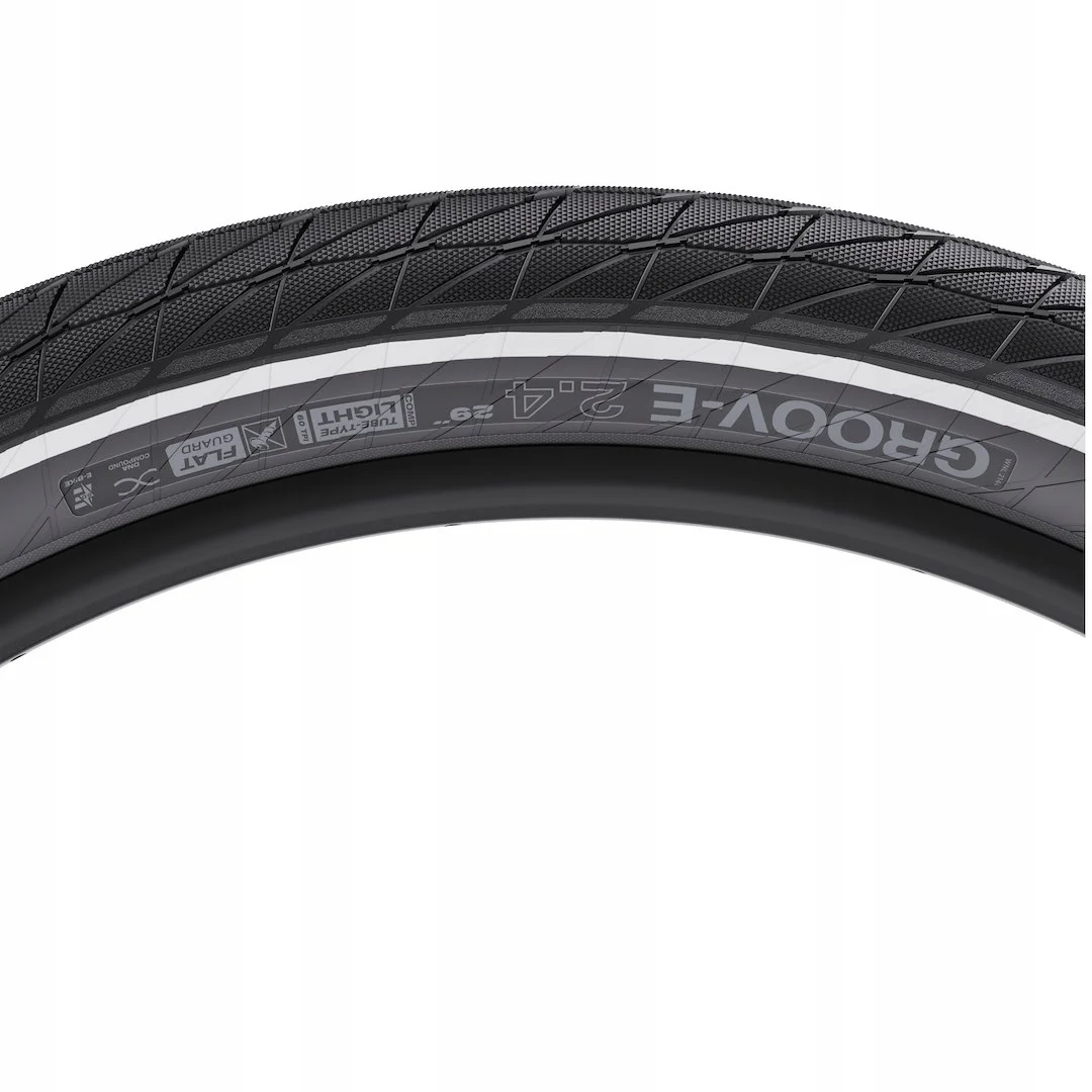 Groov-E to pierwsza opona WTB zaprojektowana specjalnie do rowerów elektrycznych. Cały bieżnik ma teksturowaną powierzchnię z rowkami odprowadzającymi wodę, które zapewniają pewną przyczepność. Wszystkie wersje opony posiadają osłonięty karkas 60 TPI, a wersja Flat Guard zapewnia dodatkową warstwę gumy, aby zapewnić niezrównaną trwałość. Opony Groov-E są wyposażone w pasek odblaskowy, który poprawia bezpieczeństwo, sprawiając, że rowerzyści są bardziej widoczni dla kierowców w środowisku miejskim. Jedna z wersji Groov-E jest wyposażona w zabezpieczenie przed przebiciem Flat Guard, dzięki czemu opona spełnia wymogi certyfikacji motoroweru ECE-R75 dla zastosowań w e-bike’ach o dużym obciążeniu i prędkości.