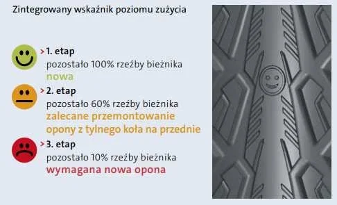 CF - Clever Face - Wskaźnik zużycia opony posiadający trzy stopnie - 100% bieżnika - 60% bieżnika, 10% bieżnika.